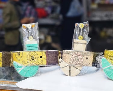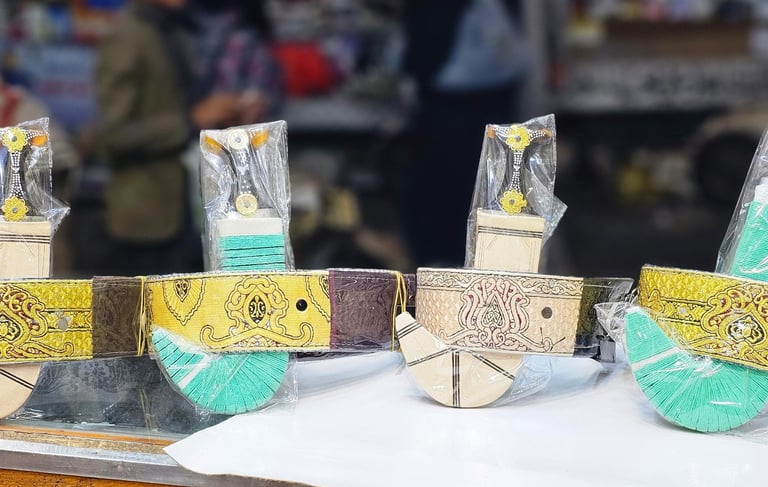 Jambiyas are traditional curved daggers worn by Yemeni men. They are tucked into a belt at the waist and are a symbol of pride and heritage. Worn on special occasions, jambiyas are often passed down from father to son.